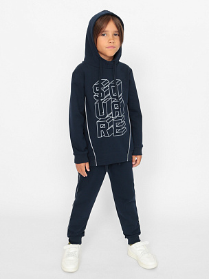 Спортивный костюм для мальчика с лампасами контрастного цвета. Куртка на молнии с капюшоном и карманом-кенгуру. Рукава-реглан, длинные, с манжетами. Нижний срез куртки обработан притачным поясом из рибаны с лайкрой. Капюшон с подкладкой из кулирки. В край капюшона вставлен шнур. Брюки с манжетами и притачным поясом из рибаны с лайкрой. В пояс вставлена резина.