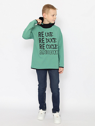 Толстовка с длинными рукавами, притачными планками по низу изделия и рукава. Капюшон с подкладкой и декоративным шнурком. Перед декорирован принтом "Перерабатывай и используй повторно".