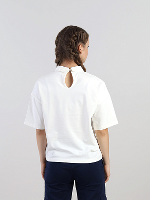 Джемпер для девочки с короткими рукавами, свободного силуэта, спущенным плечом и отложным воротником. Сзади застежка на пуговицу. Спереди декорирован металлическим лейблом.