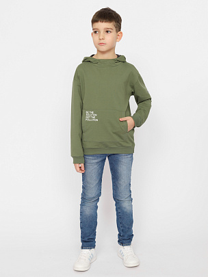 Толстовка с длинными рукавами, притачным поясом и манжетами. Манжеты и пояс выполненя из полотна с добавлением эластана. Капюшон с притачной планкой и подкладкой контрастного цвета, планка декорирована принтом. Перед декорирован принтом "тираннозавр Рекс".
