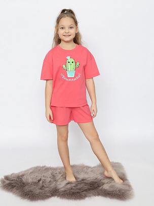 Пижама для девочки из футболки и шорт. Футболка оверсайз с круглой горловиной и короткими рукавами, свободного кроя с милым принтом. Шорты, без карманов из набивного хлопка, имеют удобную посадку, благодаря широкому эластичному поясу. Изделие изготовлено из мягкого и приятного на ощупь полотна. Пижама с шортами - это удобная и универсальная домашняя одежда, в которой можно спать, но и провести весь выходной.
