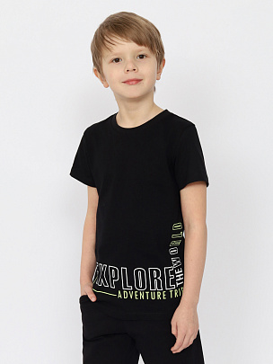 Футболка oversize со спущенным плечом, с коротким рукавом. Горловина круглая, обработана притачной бейкой из рибаны с лакрой. Плечевые швы смещены на перед и отстрочены. Перед оформлен принтом.